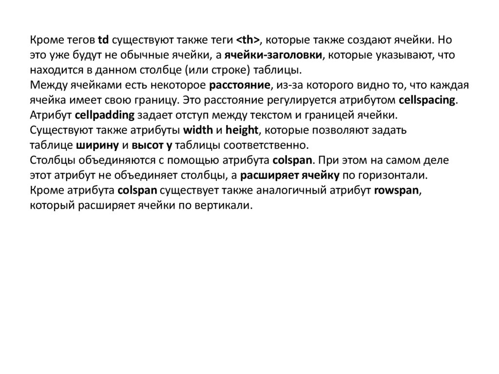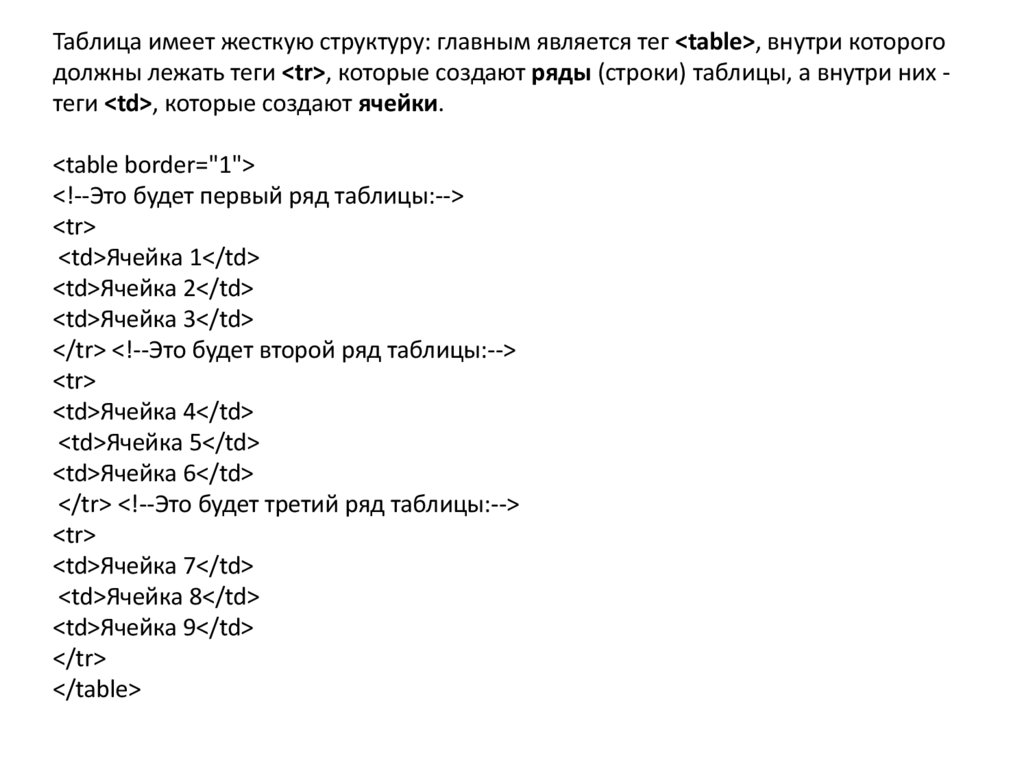 Таблица имеет жесткую структуру: главным является тег <table>, внутри которогодолжны лежать теги <tr>, которые создают ряды (строки) таблицы, а внутри них теги <td>, которые создают ячейки.