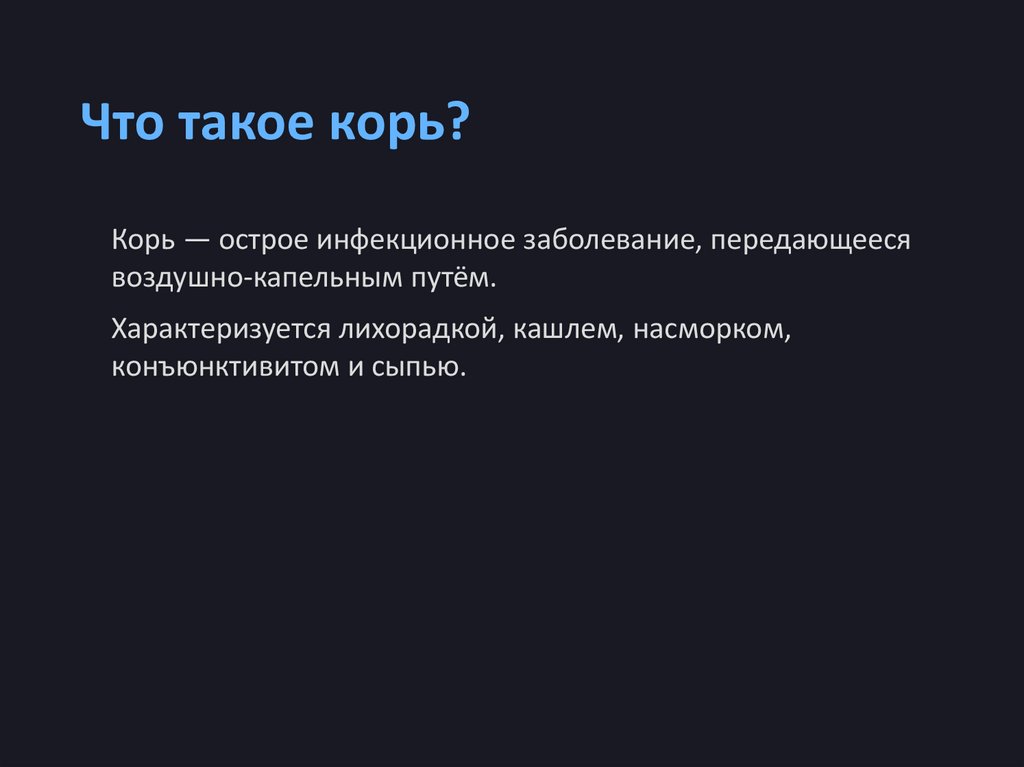 Что такое корь?Корь — острое инфекционное заболевание, передающееся