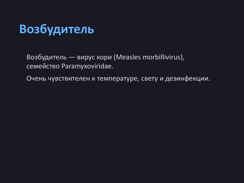 ВозбудительВозбудитель — вирус кори (Measles morbillivirus),