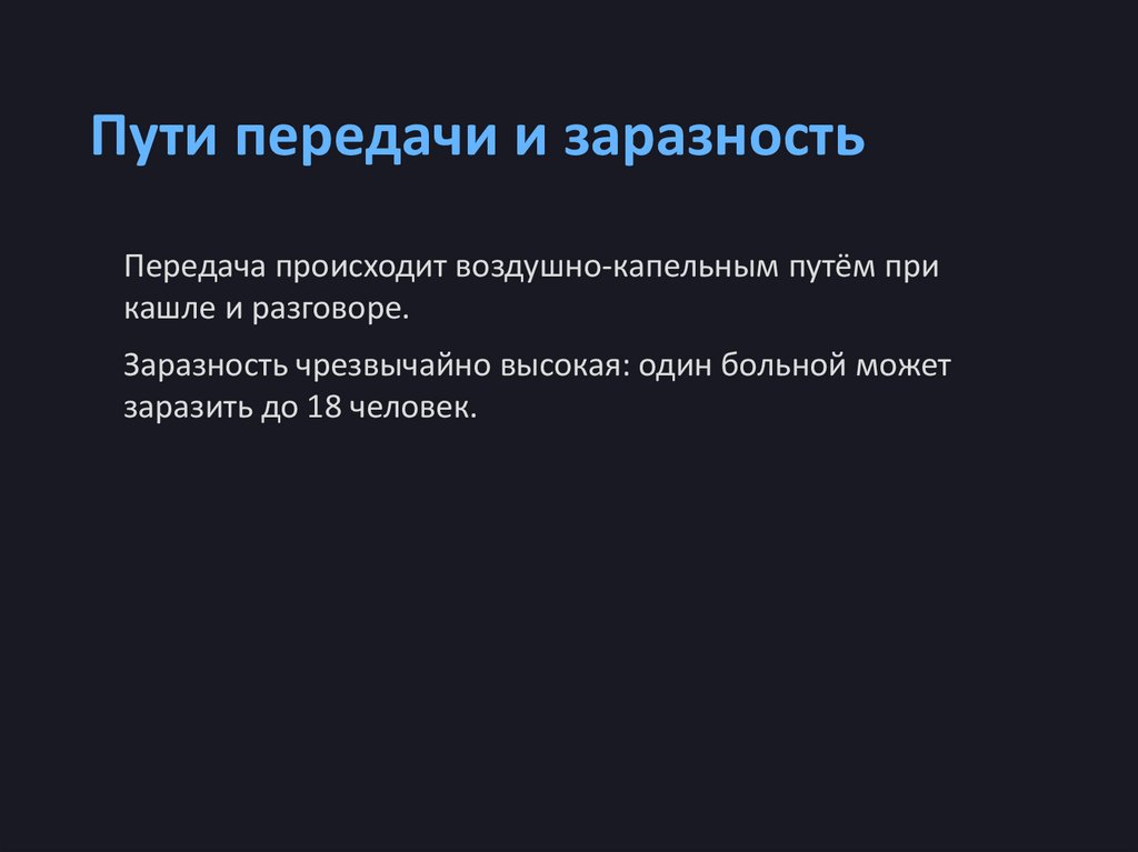 Пути передачи и заразностьПередача происходит воздушно-капельным путём при