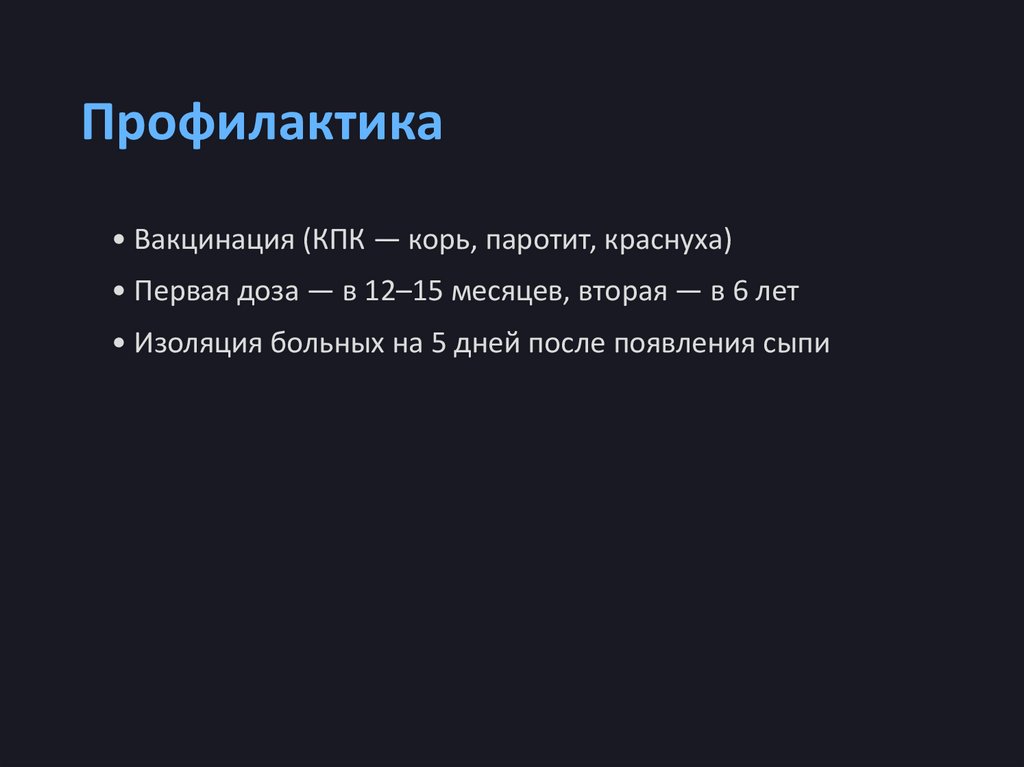 Профилактика• Вакцинация (КПК — корь, паротит, краснуха)