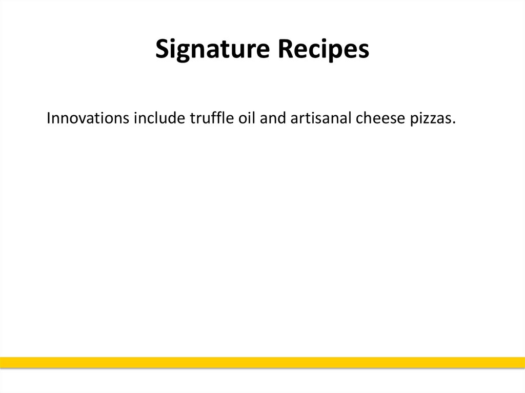 Signature RecipesInnovations include truffle oil and artisanal cheese pizzas.