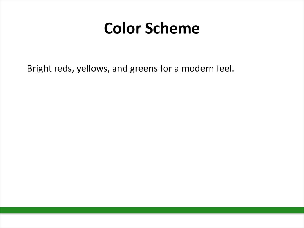 Color SchemeBright reds, yellows, and greens for a modern feel.
