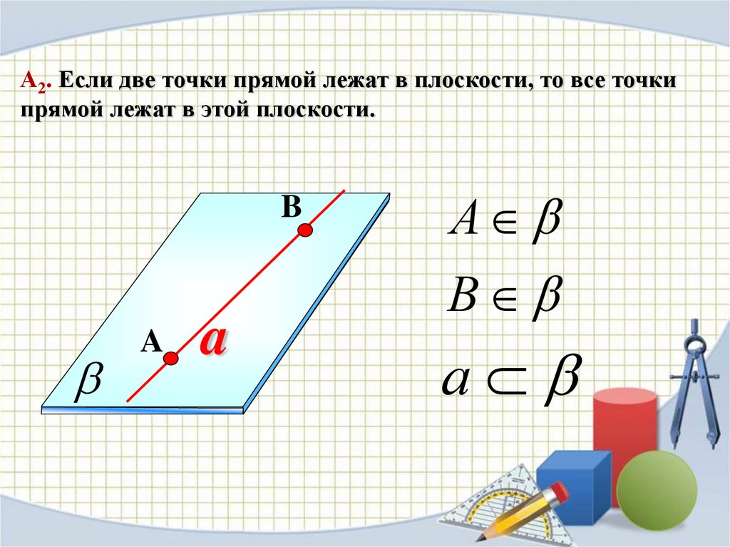 А2. Если две точки прямой лежат в плоскости, то все точкипрямой лежат в этой плоскости.