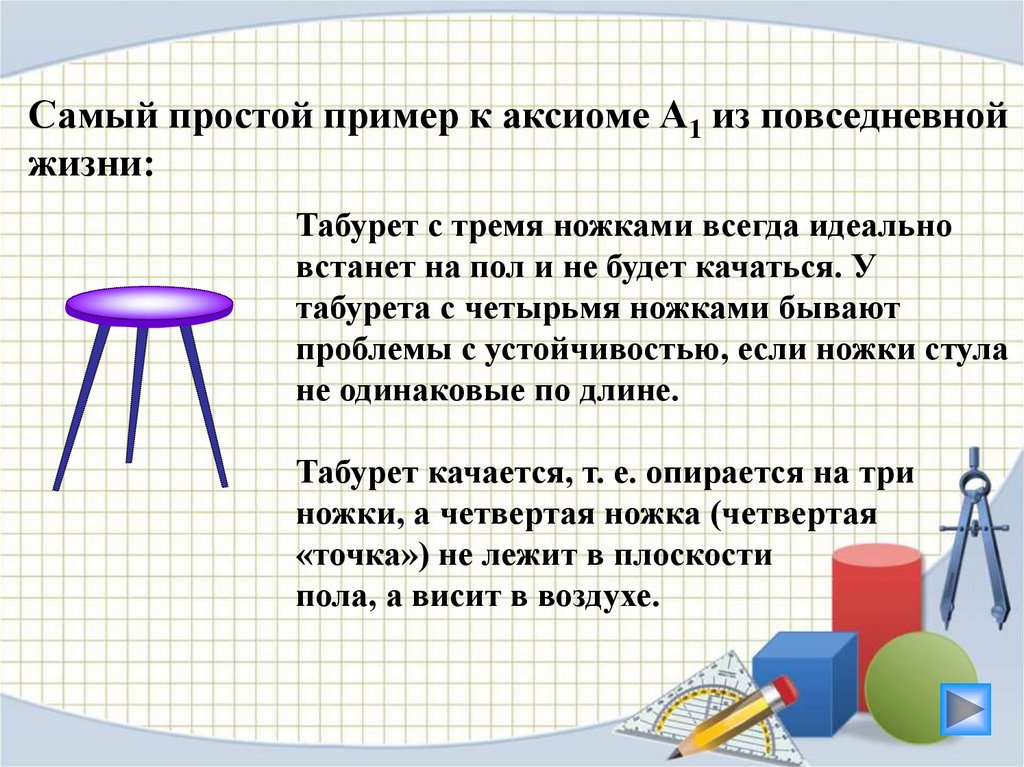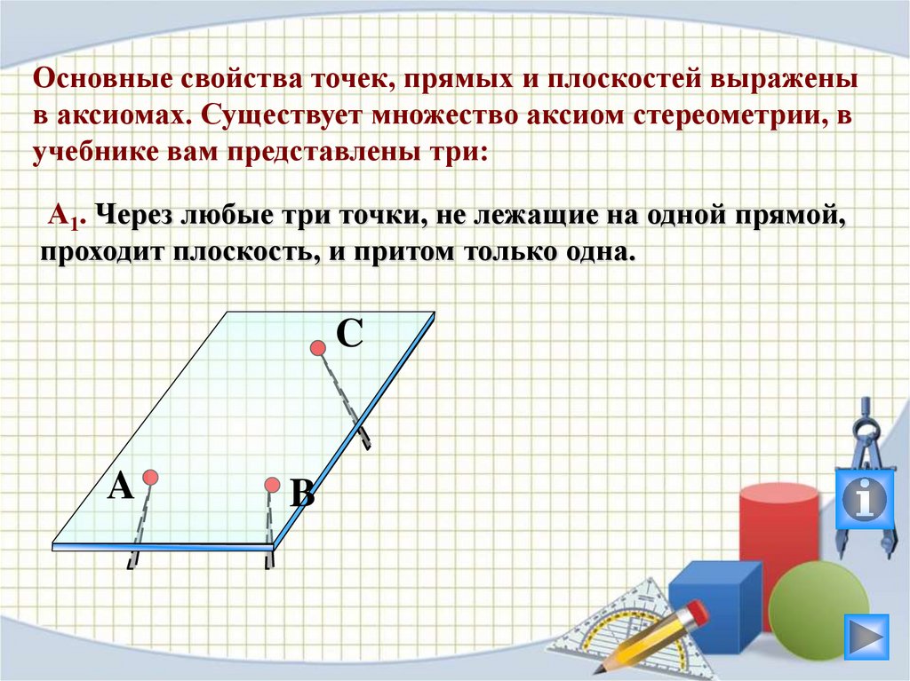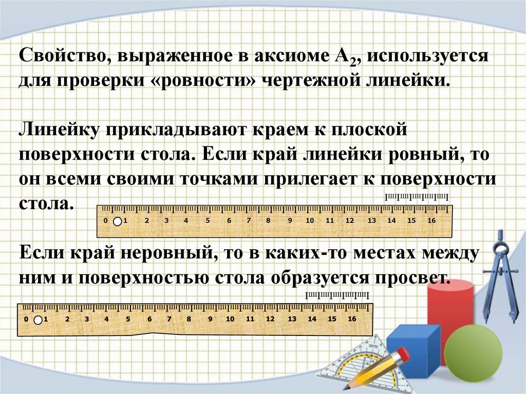 Свойство, выраженное в аксиоме А2, используетсядля проверки «ровности» чертежной линейки.