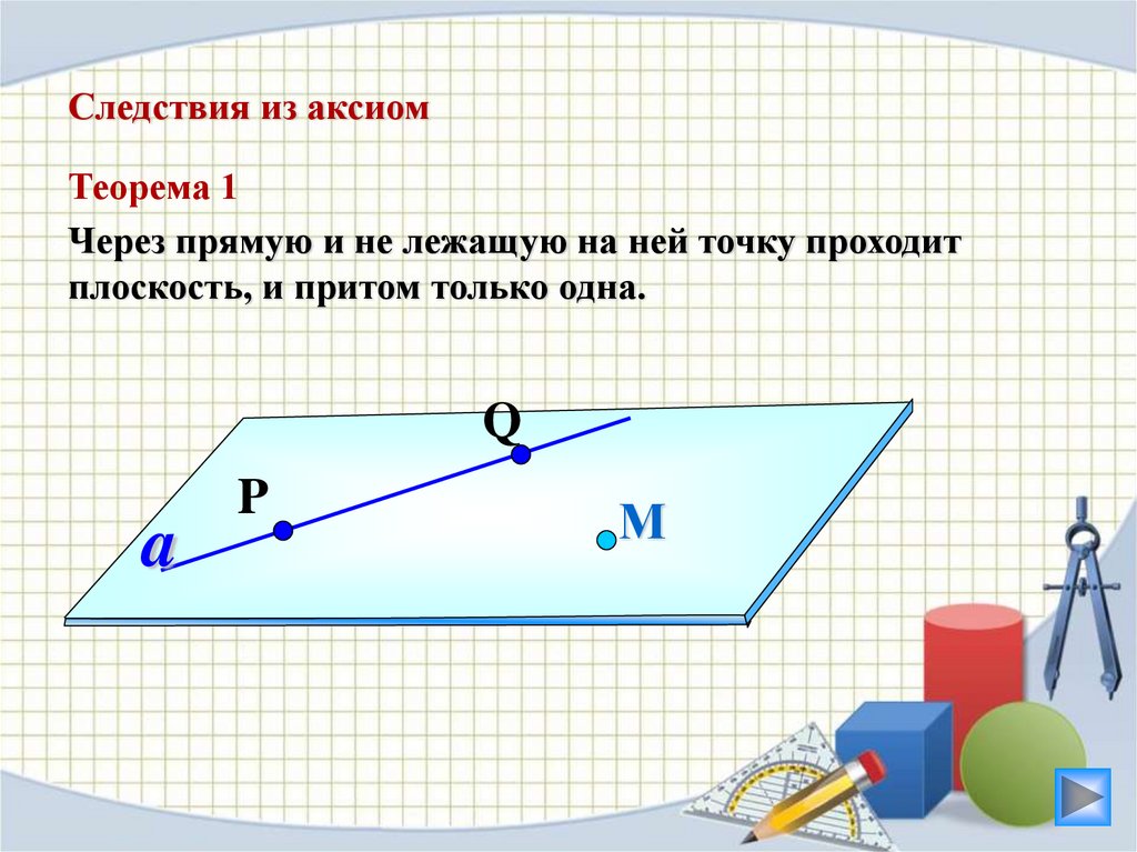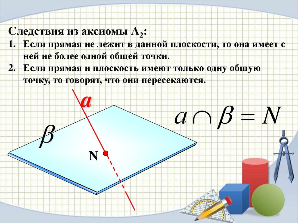 Следствия из аксиомы А2:1. Если прямая не лежит в данной плоскости, то она имеет с