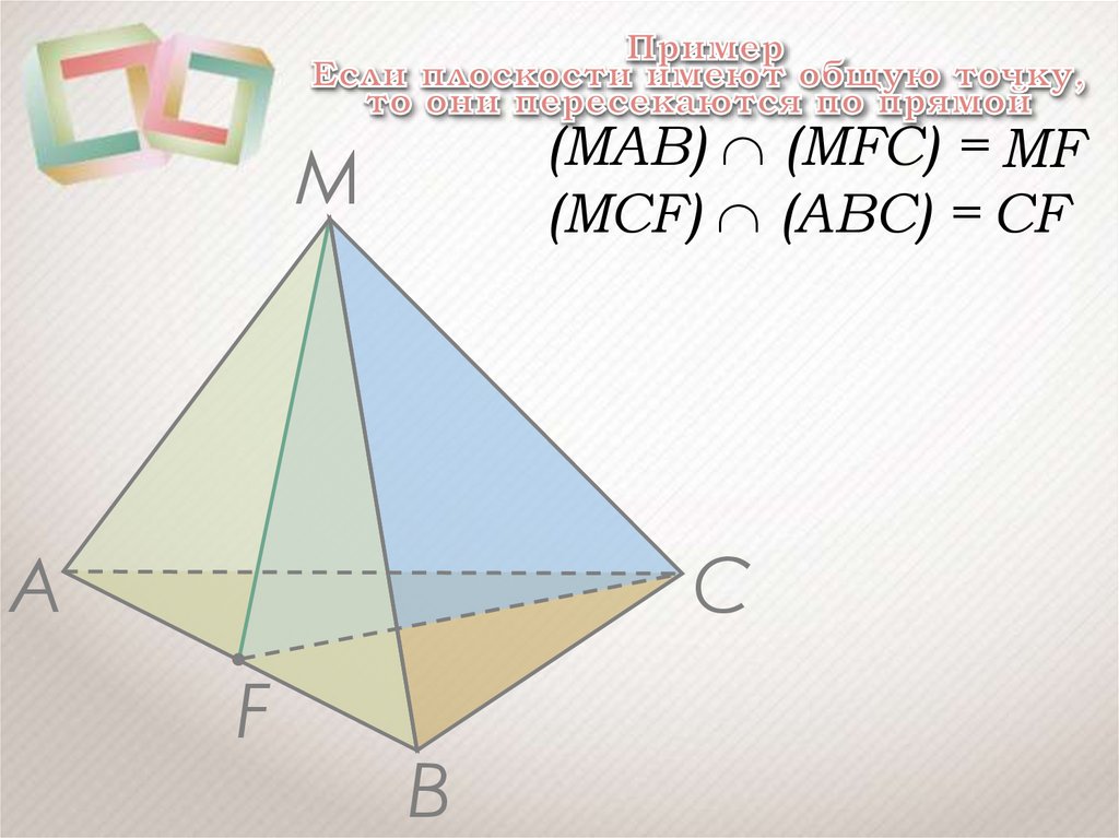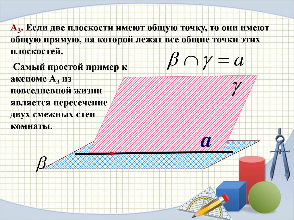А3. Если две плоскости имеют общую точку, то они имеютобщую прямую, на которой лежат все общие точки этих