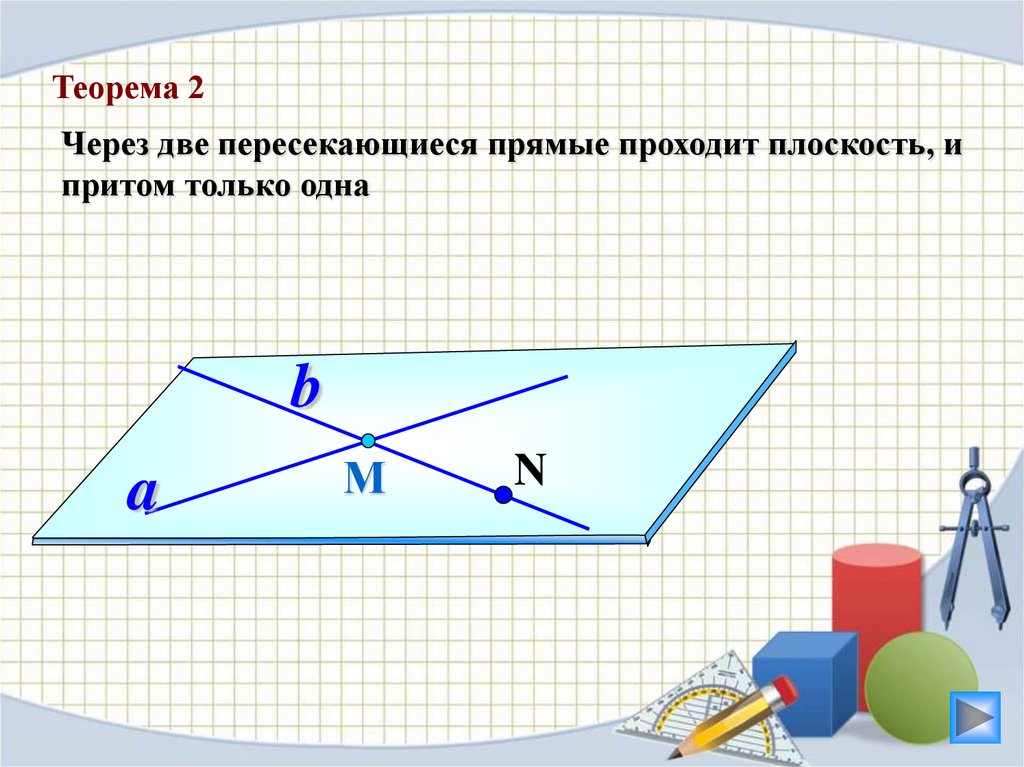 Теорема 2Через две пересекающиеся прямые проходит плоскость, и