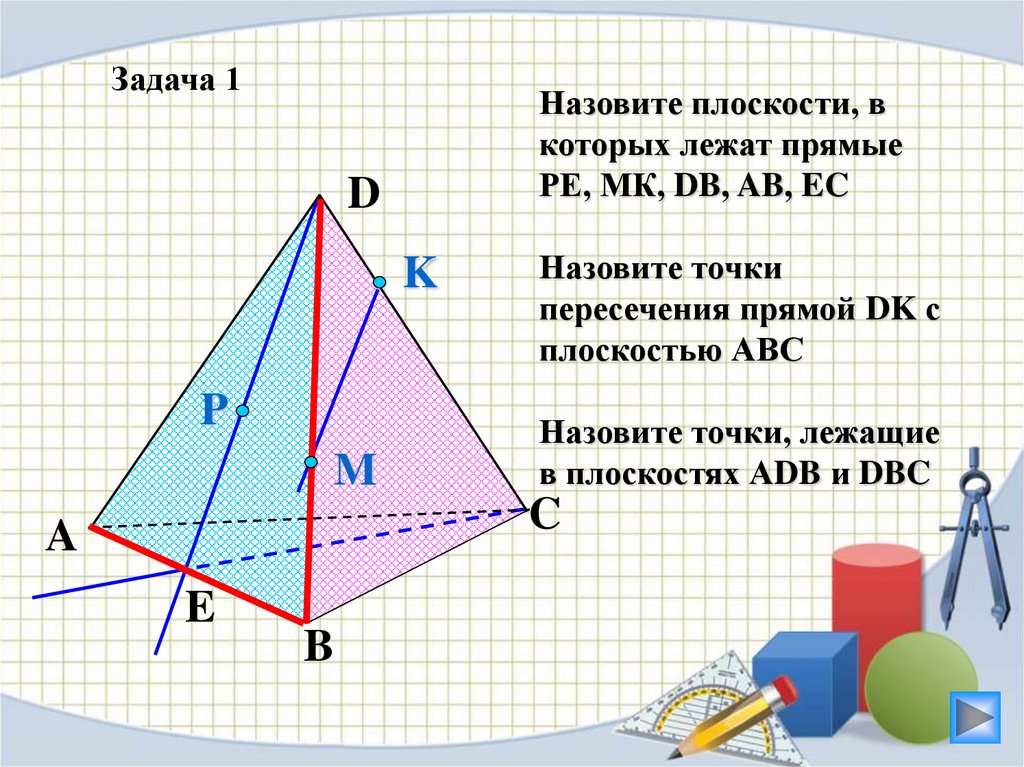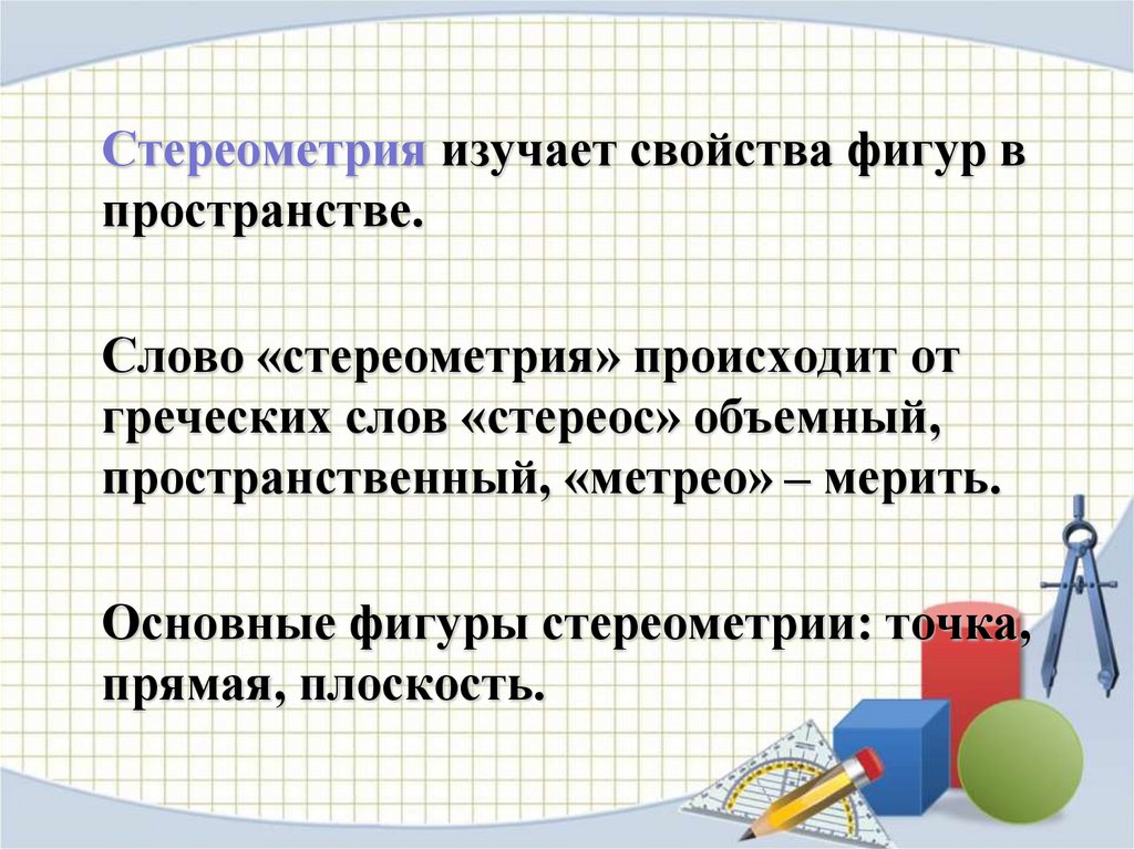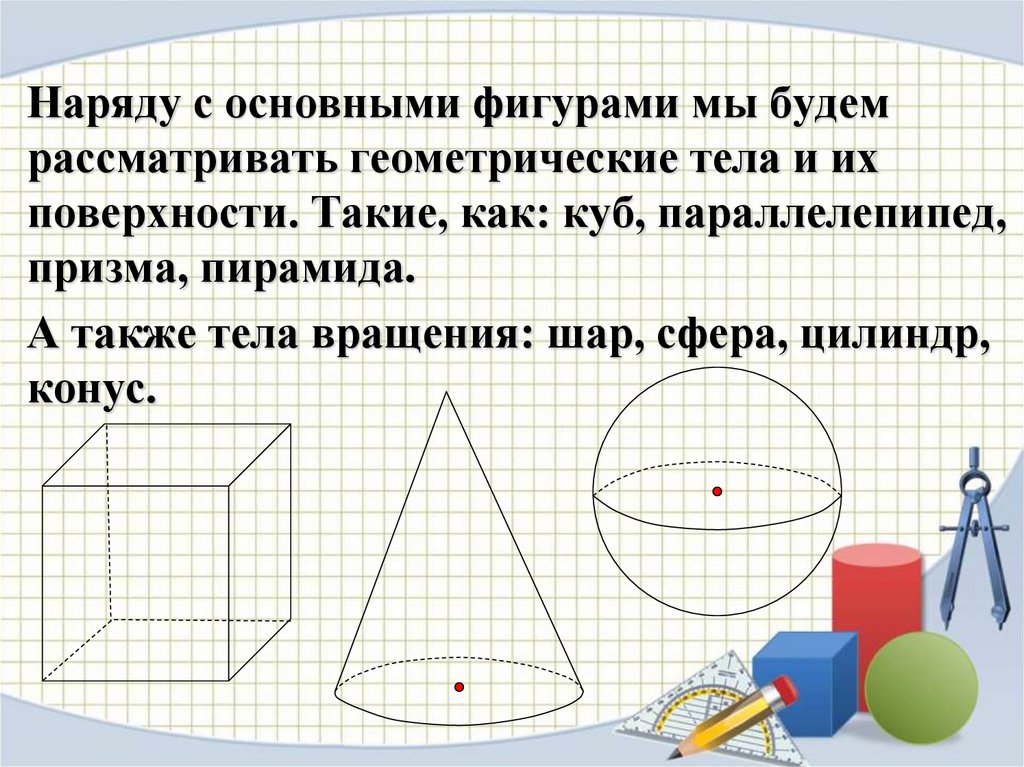Наряду с основными фигурами мы будемрассматривать геометрические тела и их