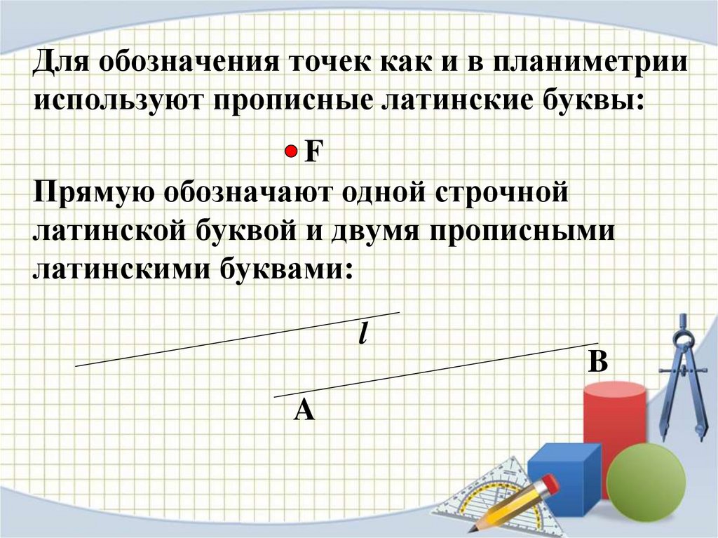 Для обозначения точек как и в планиметриииспользуют прописные латинские буквы: