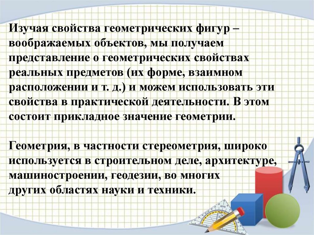 Изучая свойства геометрических фигур –воображаемых объектов, мы получаем