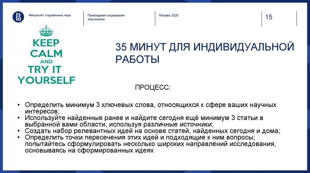 • Определить минимум 3 ключевых слова, относящихся к сфере ваших научных