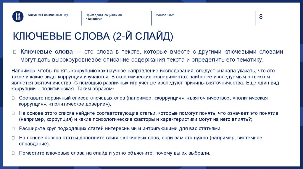◼ Составьте первичный список ключевых слов (например, «коррупция», «взяточничество», «политическая