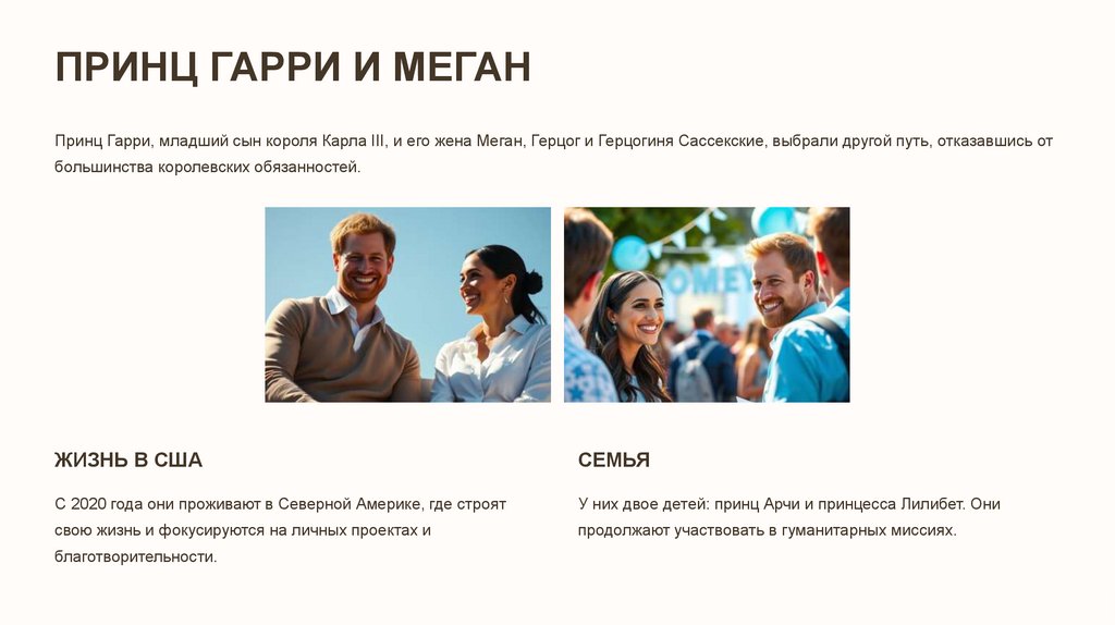ПРИНЦ ГАРРИ И МЕГАНПринц Гарри, младший сын короля Карла III, и его жена Меган, Герцог и Герцогиня Сассекские, выбрали другой путь, отказавшись от
