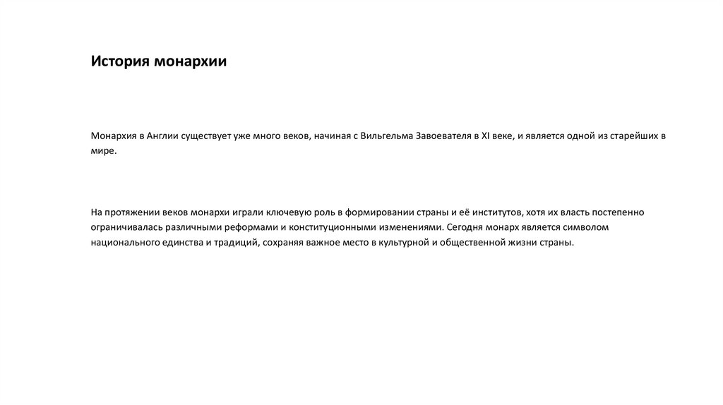 История монархииМонархия в Англии существует уже много веков, начиная с Вильгельма Завоевателя в XI веке, и является одной из старейших в