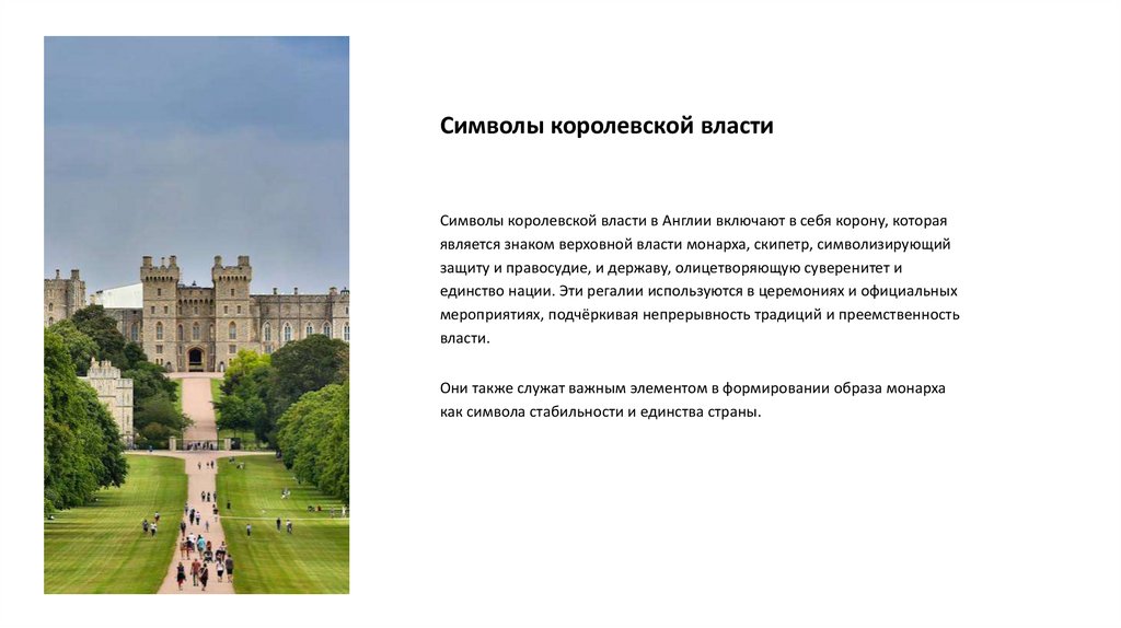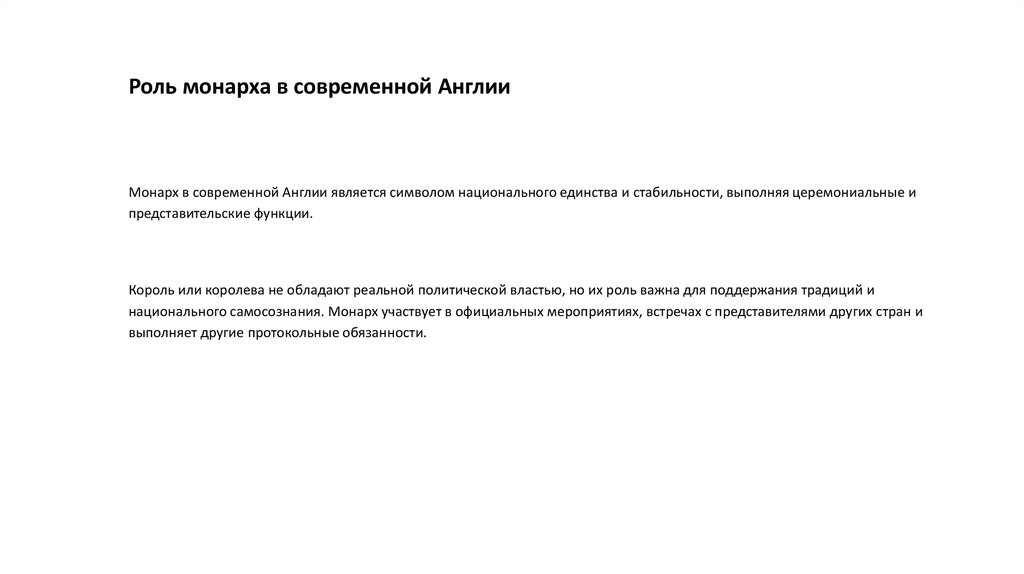 Роль монарха в современной АнглииМонарх в современной Англии является символом национального единства и стабильности, выполняя церемониальные и