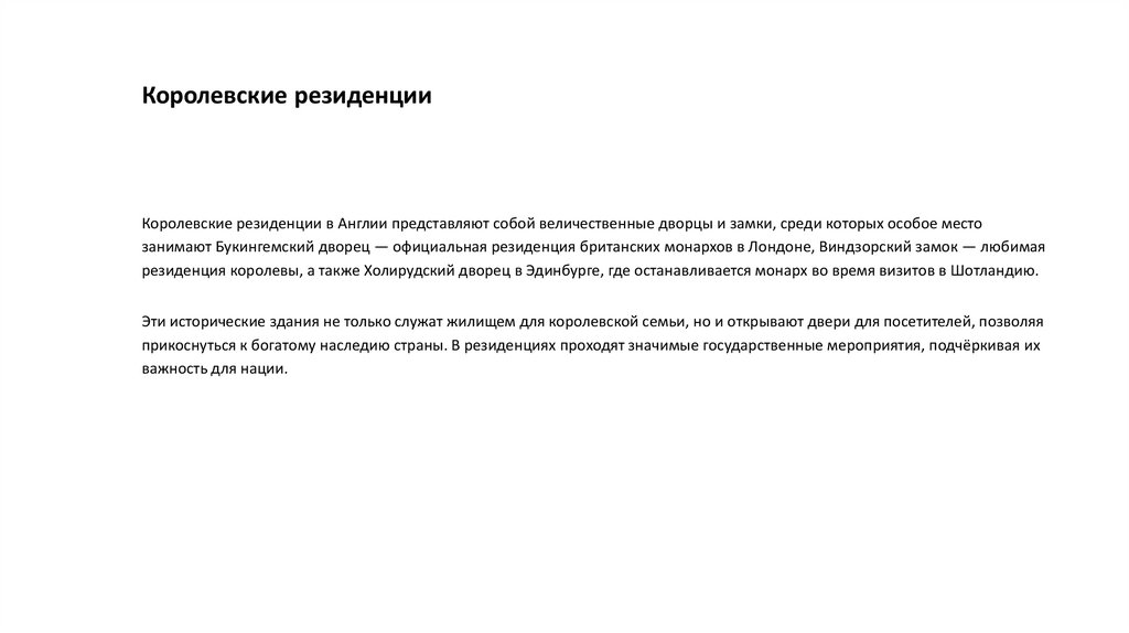 Королевские резиденцииКоролевские резиденции в Англии представляют собой величественные дворцы и замки, среди которых особое место