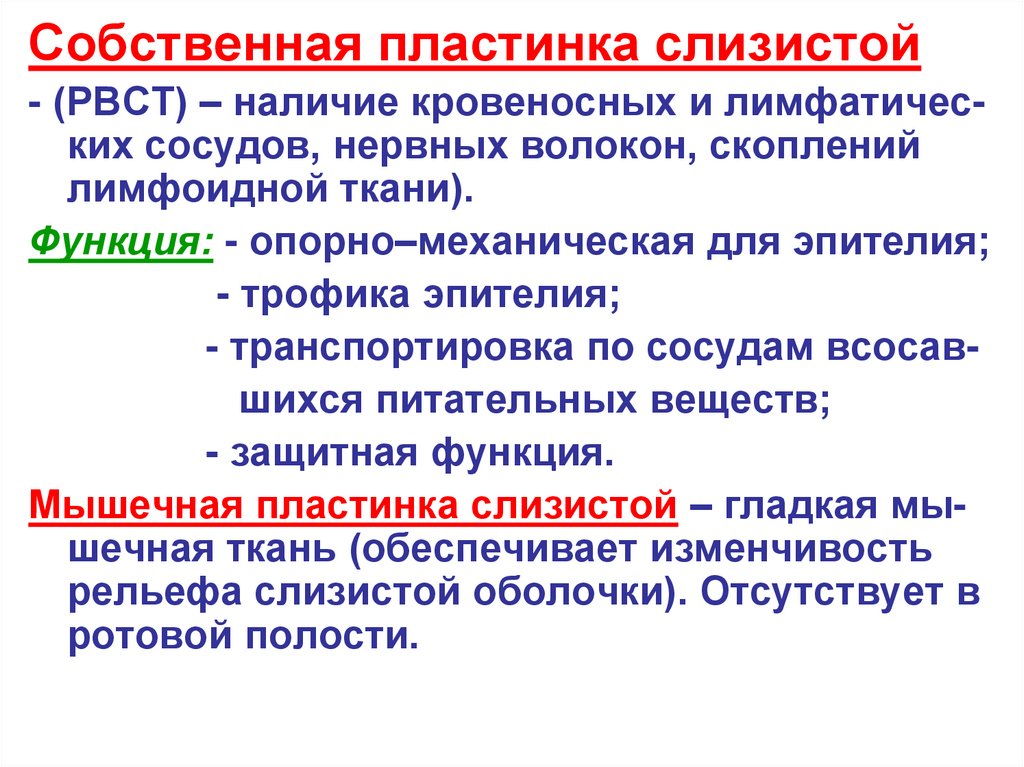 Собственная пластинка слизистой- (РВСТ) – наличие кровеносных и лимфатических сосудов, нервных волокон, скоплений