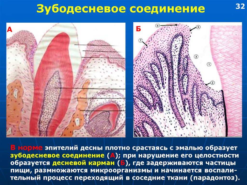 В норме эпителий десны плотно срастаясь с эмалью образует