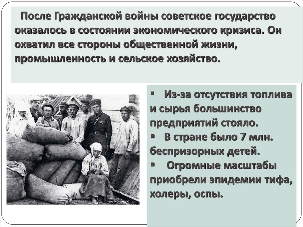 После Гражданской войны советское государствооказалось в состоянии экономического кризиса. Он