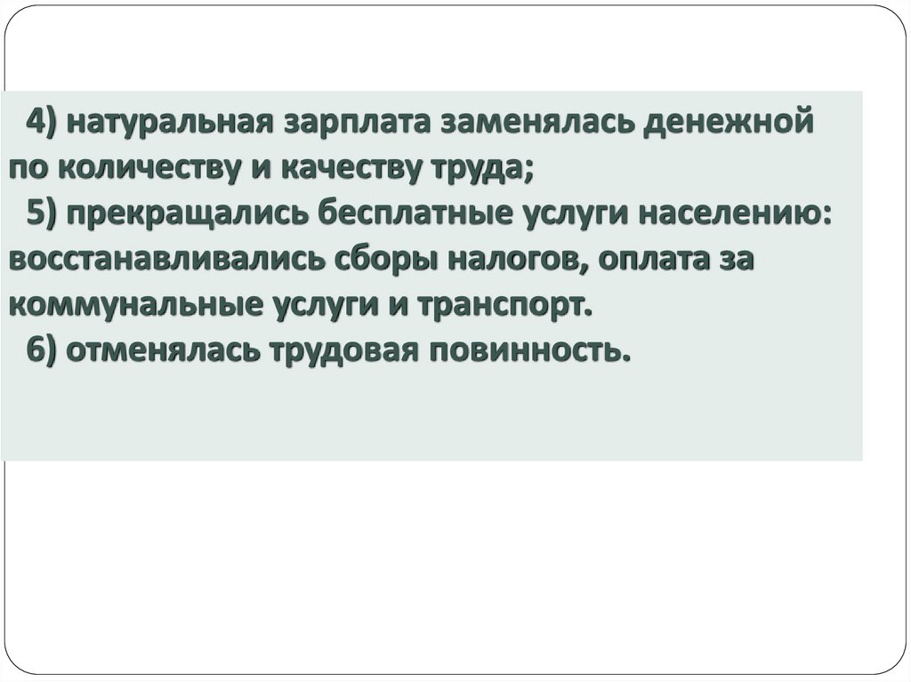 наёмного труда. 7. Запрет торговли. 8. Отмена трудовой