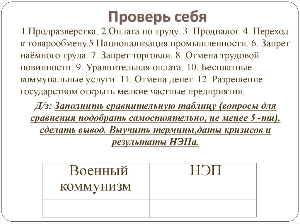 Проверь себя1.Продразверстка. 2.Оплата по труду. 3. Продналог. 4. Переход