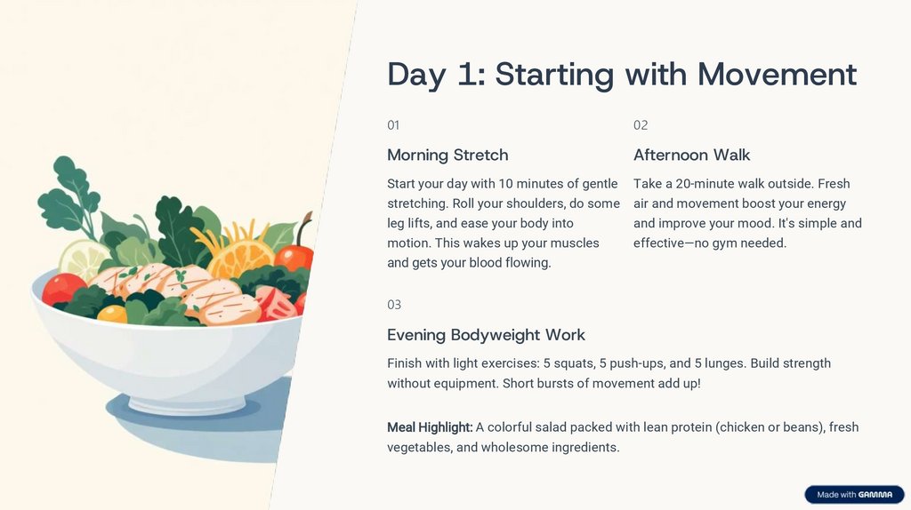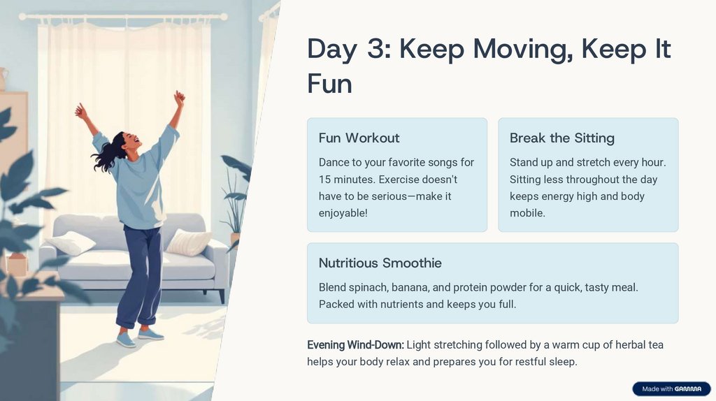 Combine gentle activities like yoga and walking with short strength moves. Variety keeps your