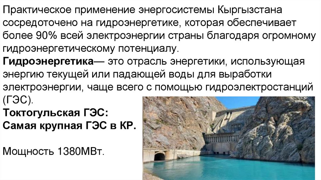 Практическое применение энергосистемы Кыргызстанасосредоточено на гидроэнергетике, которая обеспечивает