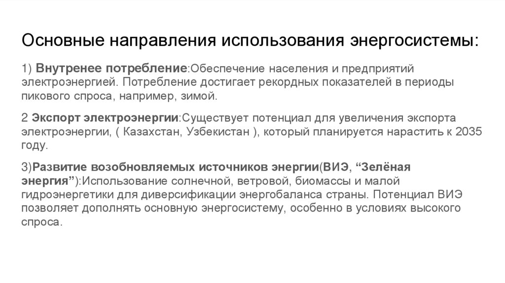 Основные направления использования энергосистемы:1) Внутренее потребление:Обеспечение населения и предприятий
