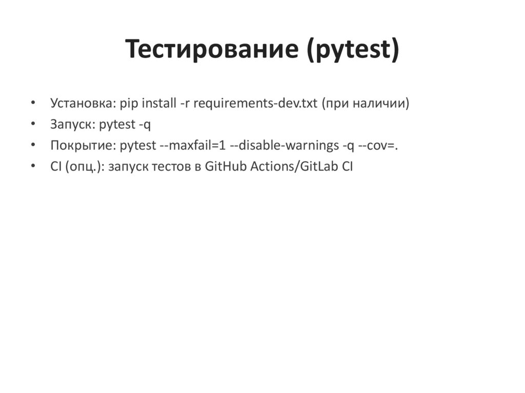 Тестирование (pytest)Установка: pip install -r requirements-dev.txt (при наличии)