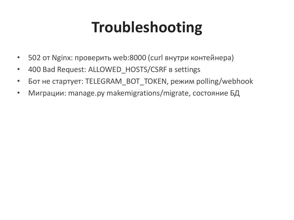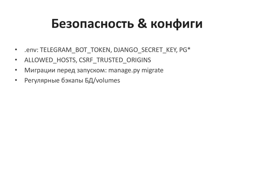 Безопасность & конфиги.env: TELEGRAM_BOT_TOKEN, DJANGO_SECRET_KEY, PG*