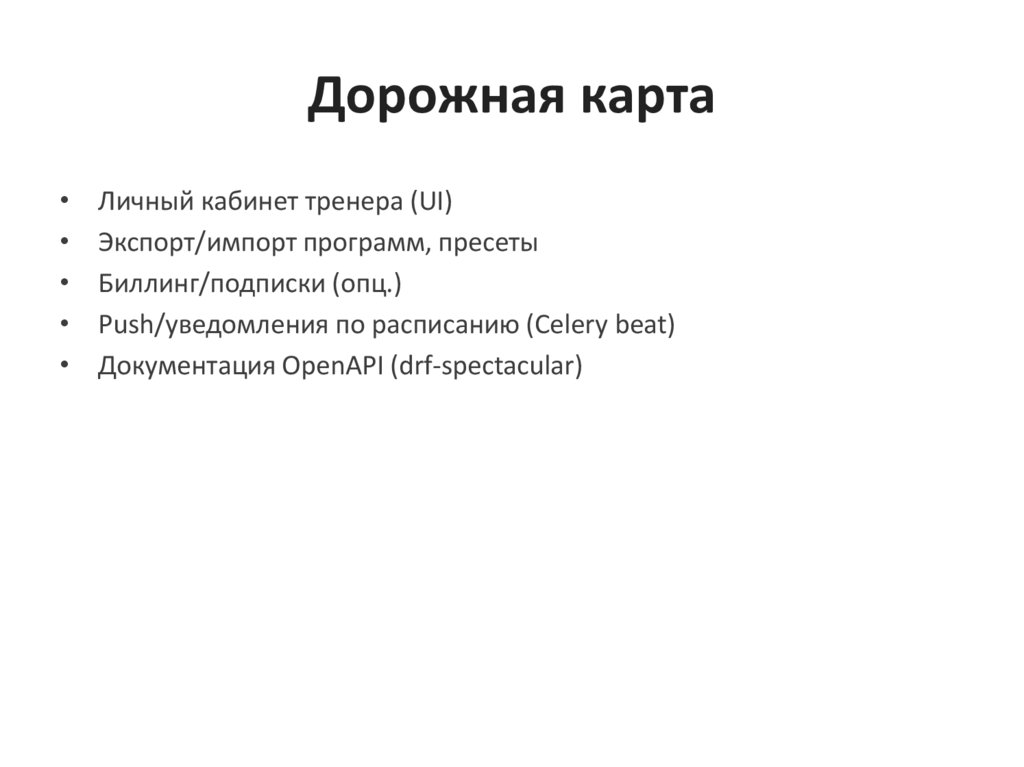 API (DRF, high-level)• Эндпоинты (пример): /api/exercises, /api/programs, /api/clients