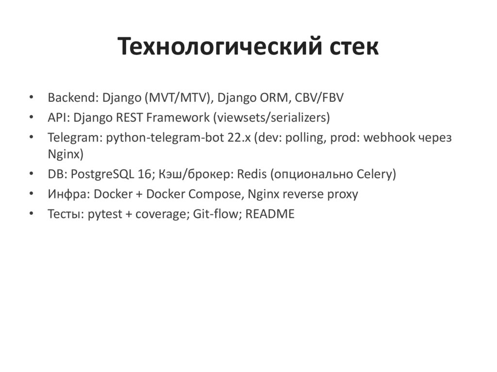 Технологический стек• Backend: Django (MVT/MTV), Django ORM, CBV/FBV