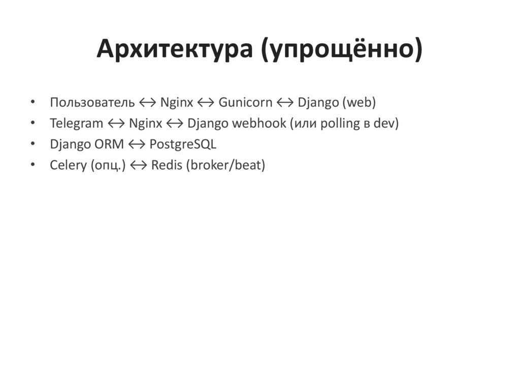 Архитектура (упрощённо)Пользователь ↔ Nginx ↔ Gunicorn ↔ Django (web)