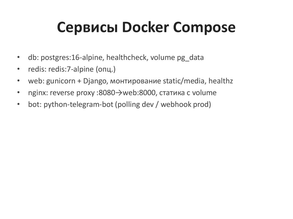 • Надёжный деплой в Docker/Compose за Nginx, Postgres, Redis