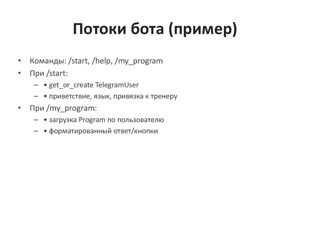 Потоки бота (пример)• Команды: /start, /help, /my_program