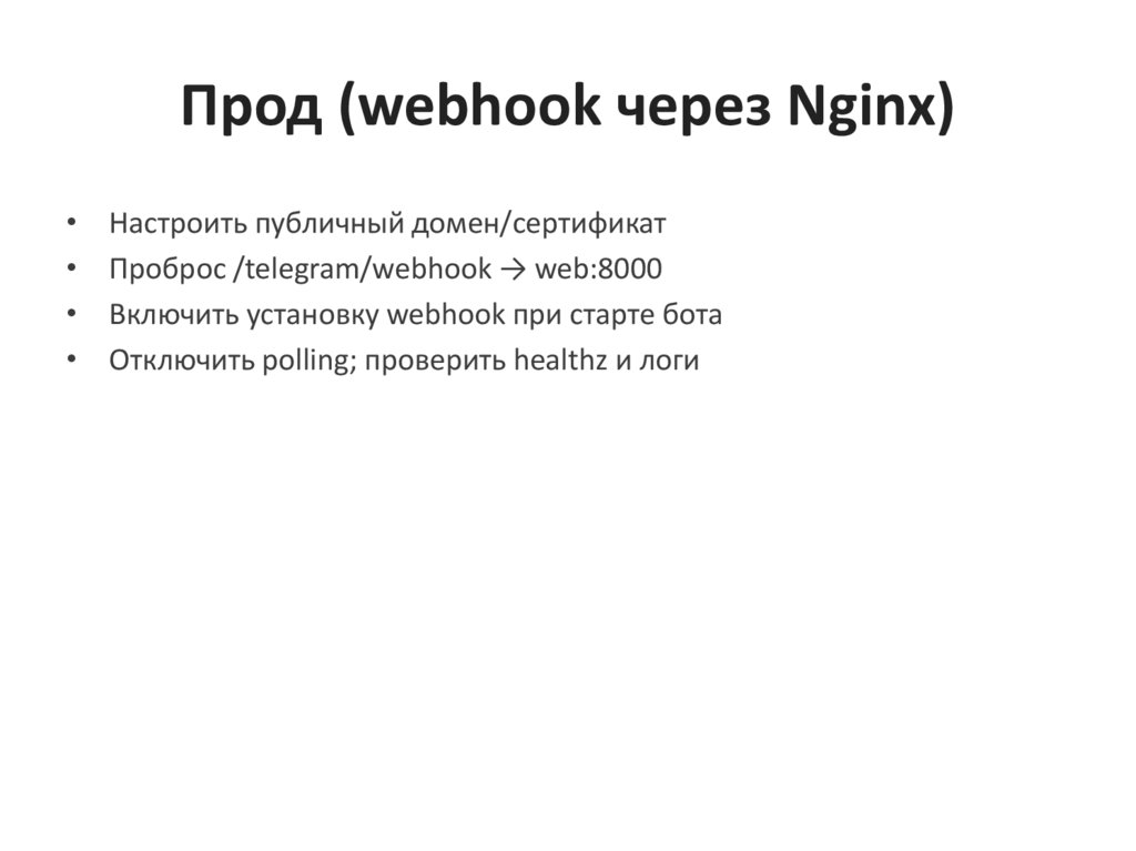 Прод (webhook через Nginx)Настроить публичный домен/сертификат