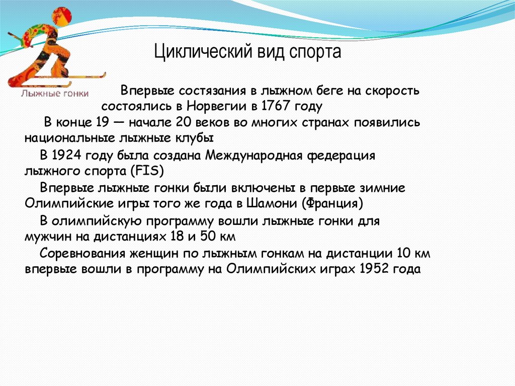 Циклический вид спортаВпервые состязания в лыжном беге на скорость