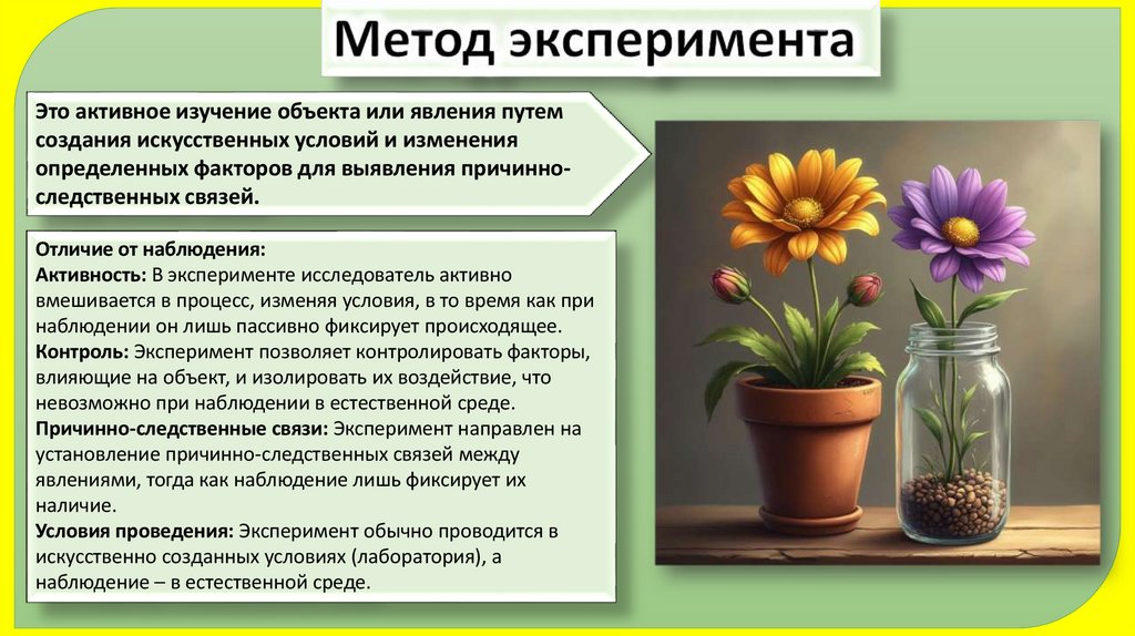 Это активное изучение объекта или явления путемсоздания искусственных условий и изменения