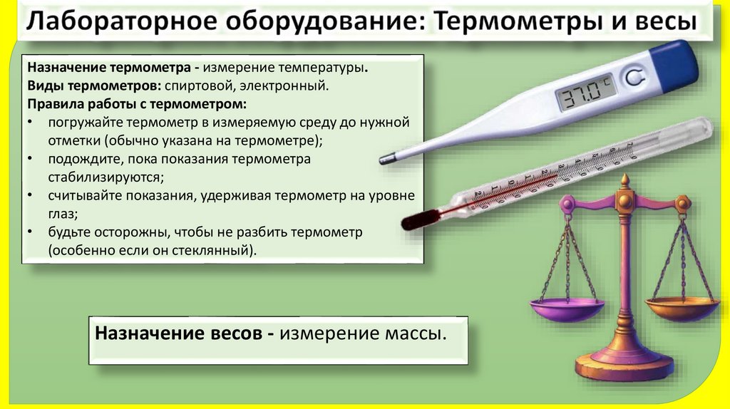 Назначение термометра - измерение температуры.Виды термометров: спиртовой, электронный.