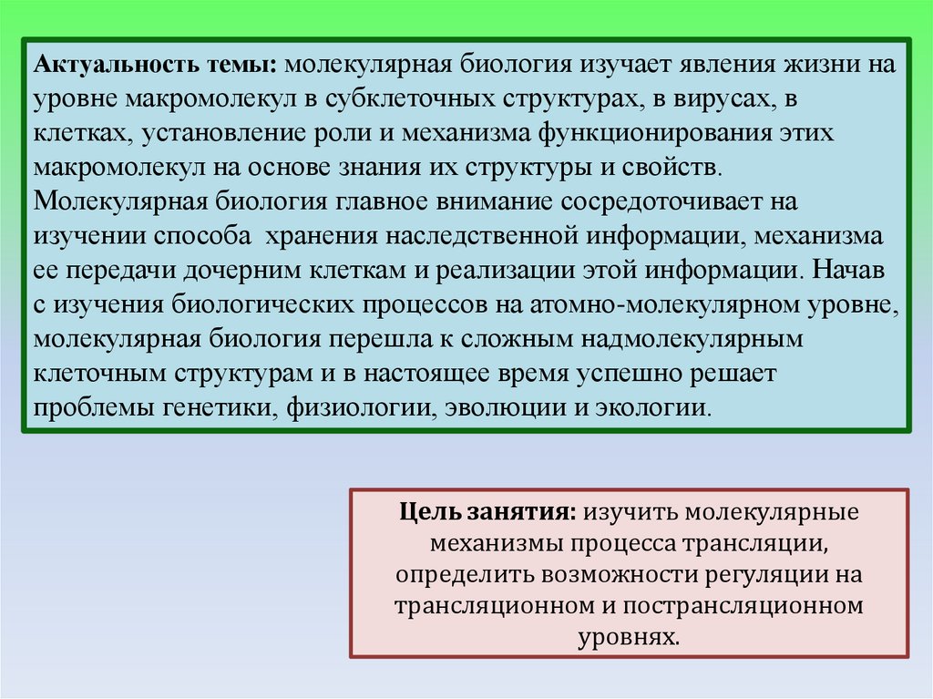 Актуальность темы: молекулярная биология изучает явления жизни науровне макромолекул в субклеточных структурах, в вирусах, в