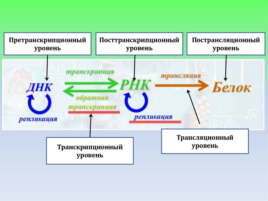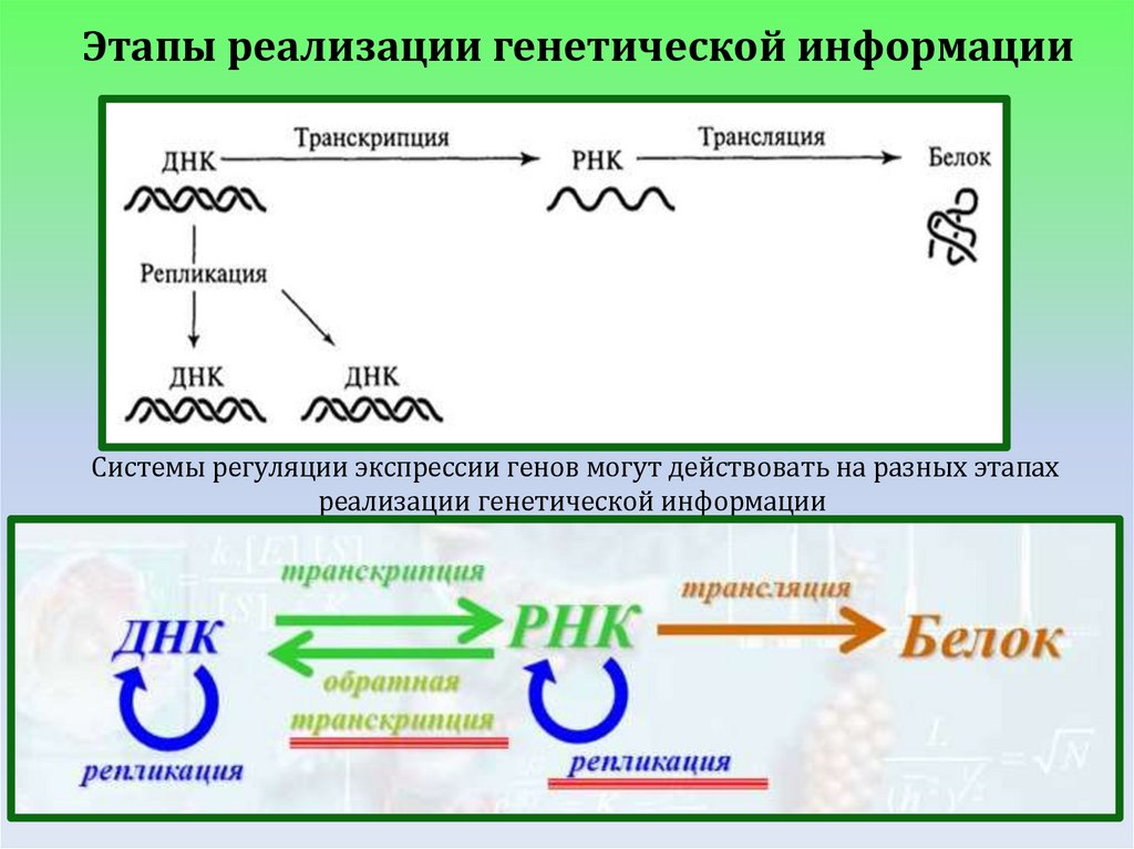 Этапы реализации генетической информацииСистемы регуляции экспрессии генов могут действовать на разных этапах