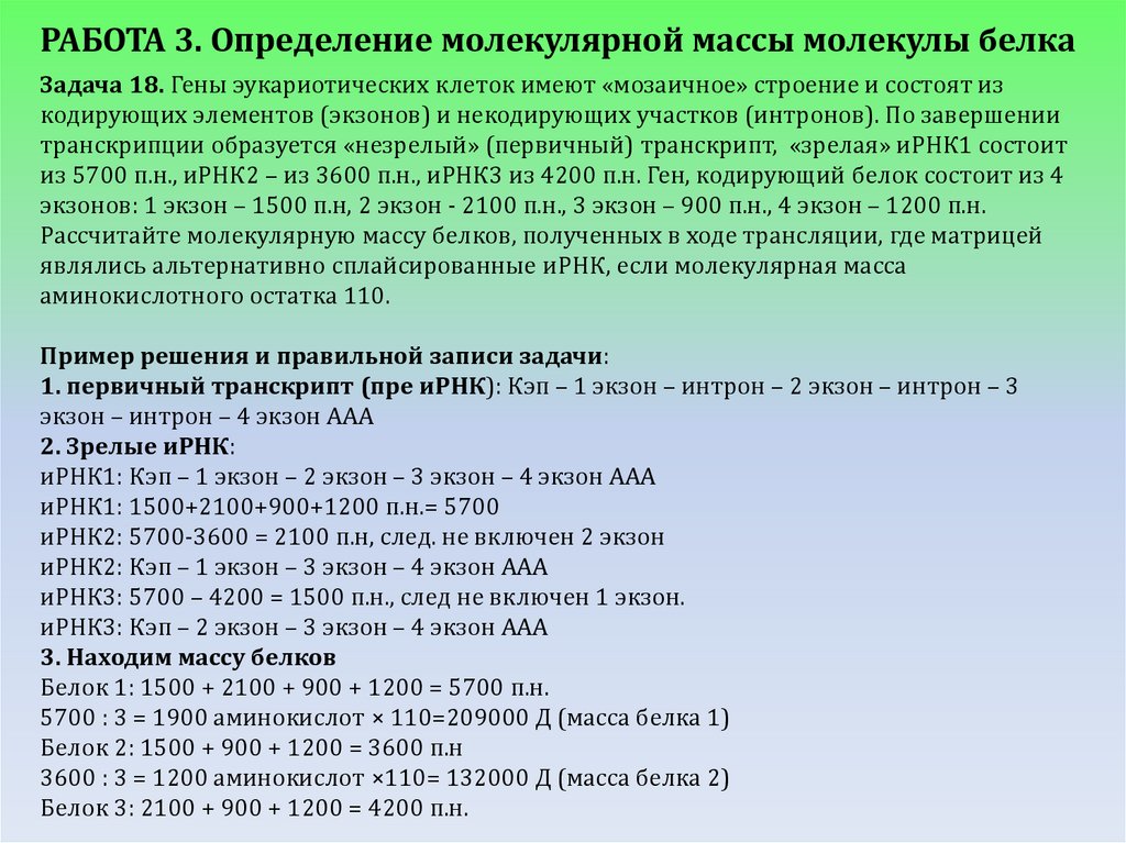 РАБОТА 3. Определение молекулярной массы молекулы белкаЗадача 18. Гены эукариотических клеток имеют «мозаичное» строение и состоят из