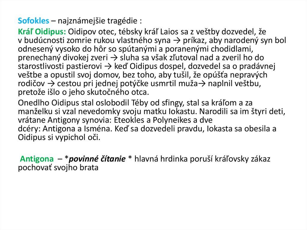 Sofokles – najznámejšie tragédie :Kráľ Oidipus: Oidipov otec, tébsky kráľ Laios sa z veštby dozvedel, že
