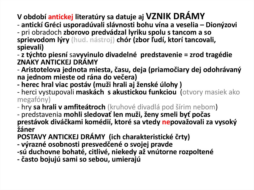 V období antickej literatúry sa datuje aj VZNIK DRÁMY- antickí Gréci usporadúvali slávnosti bohu vína a veselia – Dionýzovi