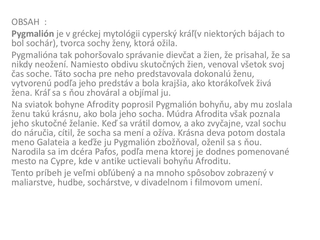 OBSAH :Pygmalión je v gréckej mytológii cyperský kráľ(v niektorých bájach to