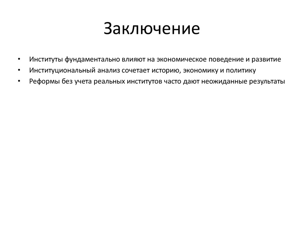 ЗаключениеИнституты фундаментально влияют на экономическое поведение и развитие