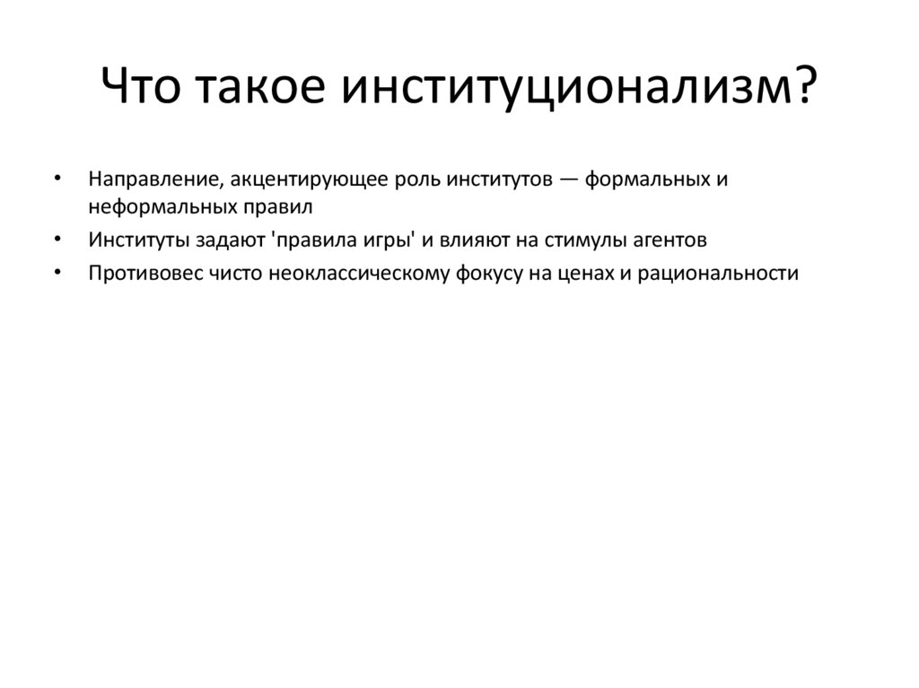 Что такое институционализм?Направление, акцентирующее роль институтов — формальных и