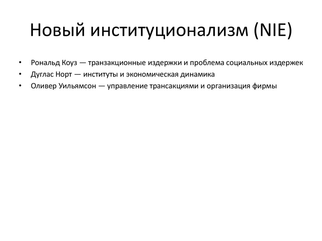 Новый институционализм (NIE)Рональд Коуз — транзакционные издержки и проблема социальных издержек