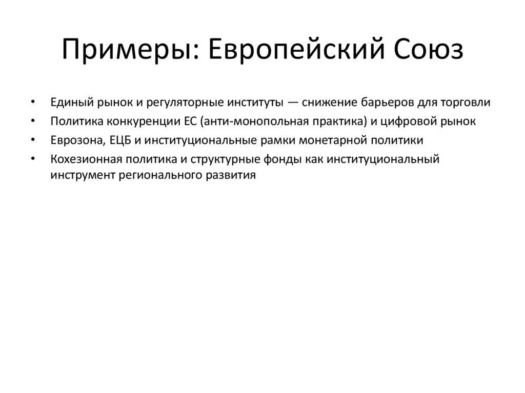 Примеры: Европейский СоюзЕдиный рынок и регуляторные институты — снижение барьеров для торговли